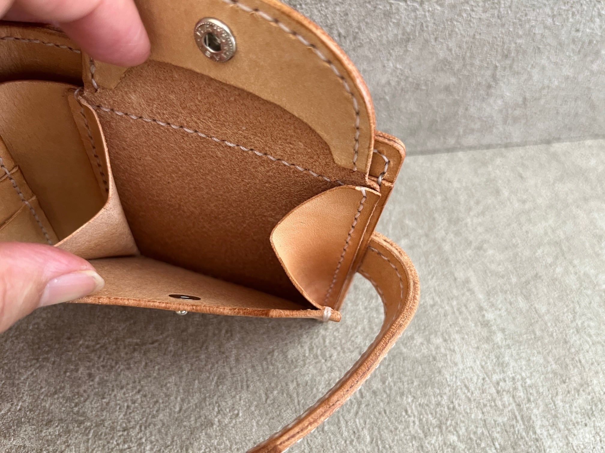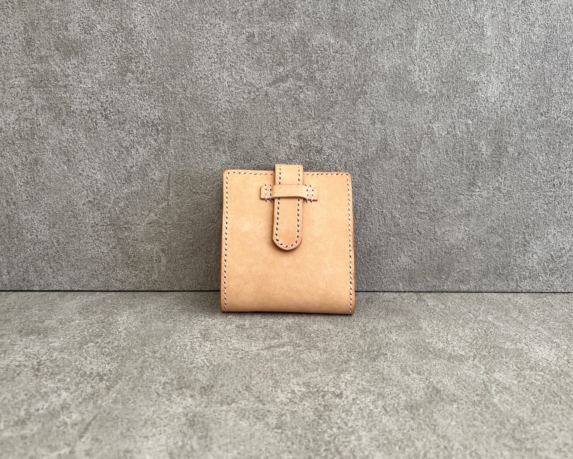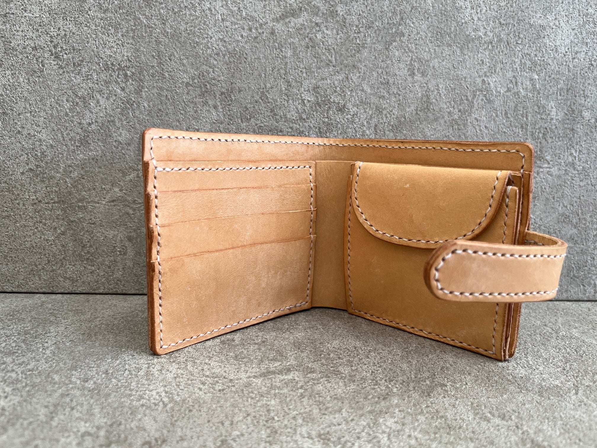ナチュラルを使って、手縫いで作ったベルト式二つ折り財布です。