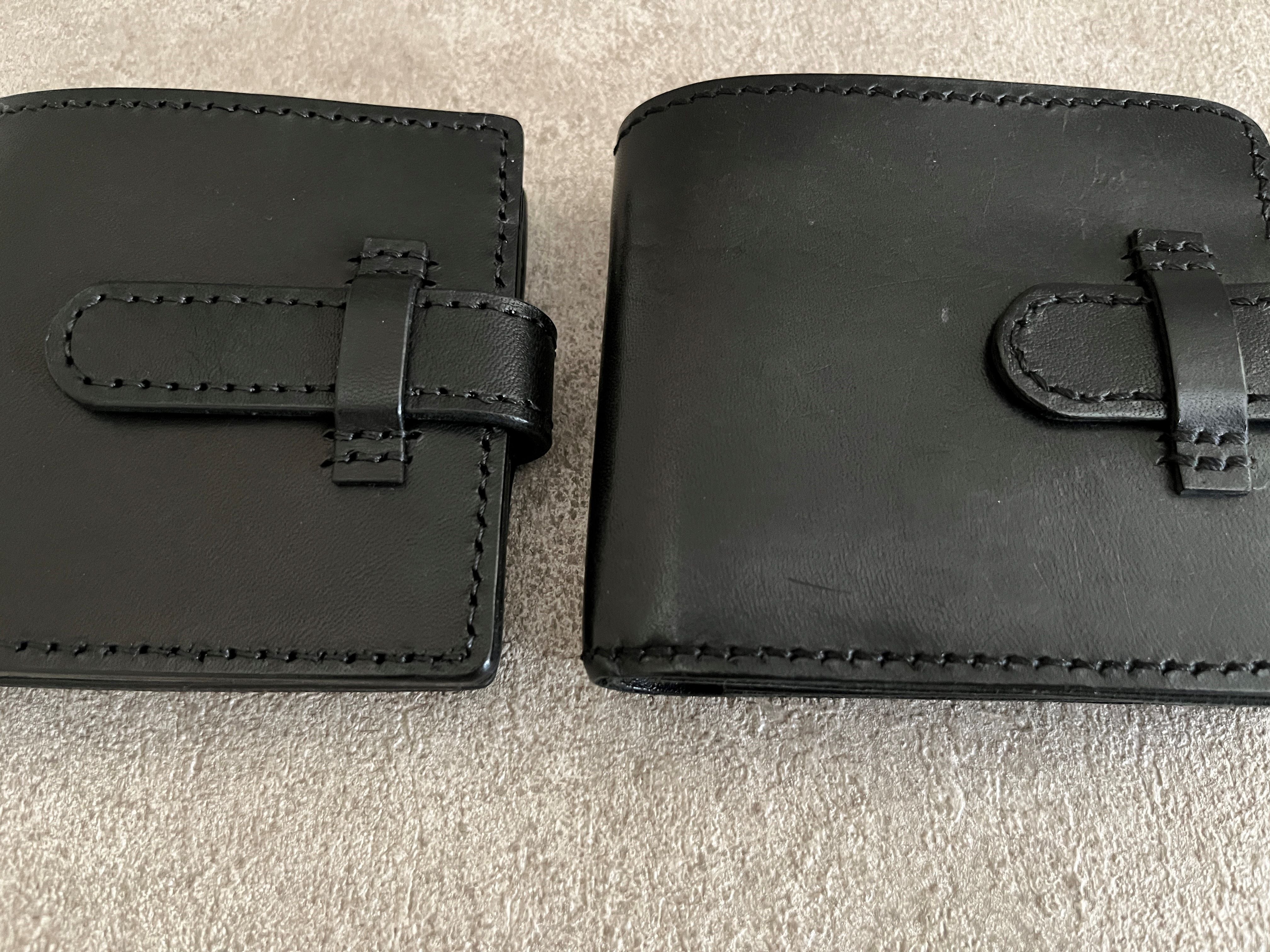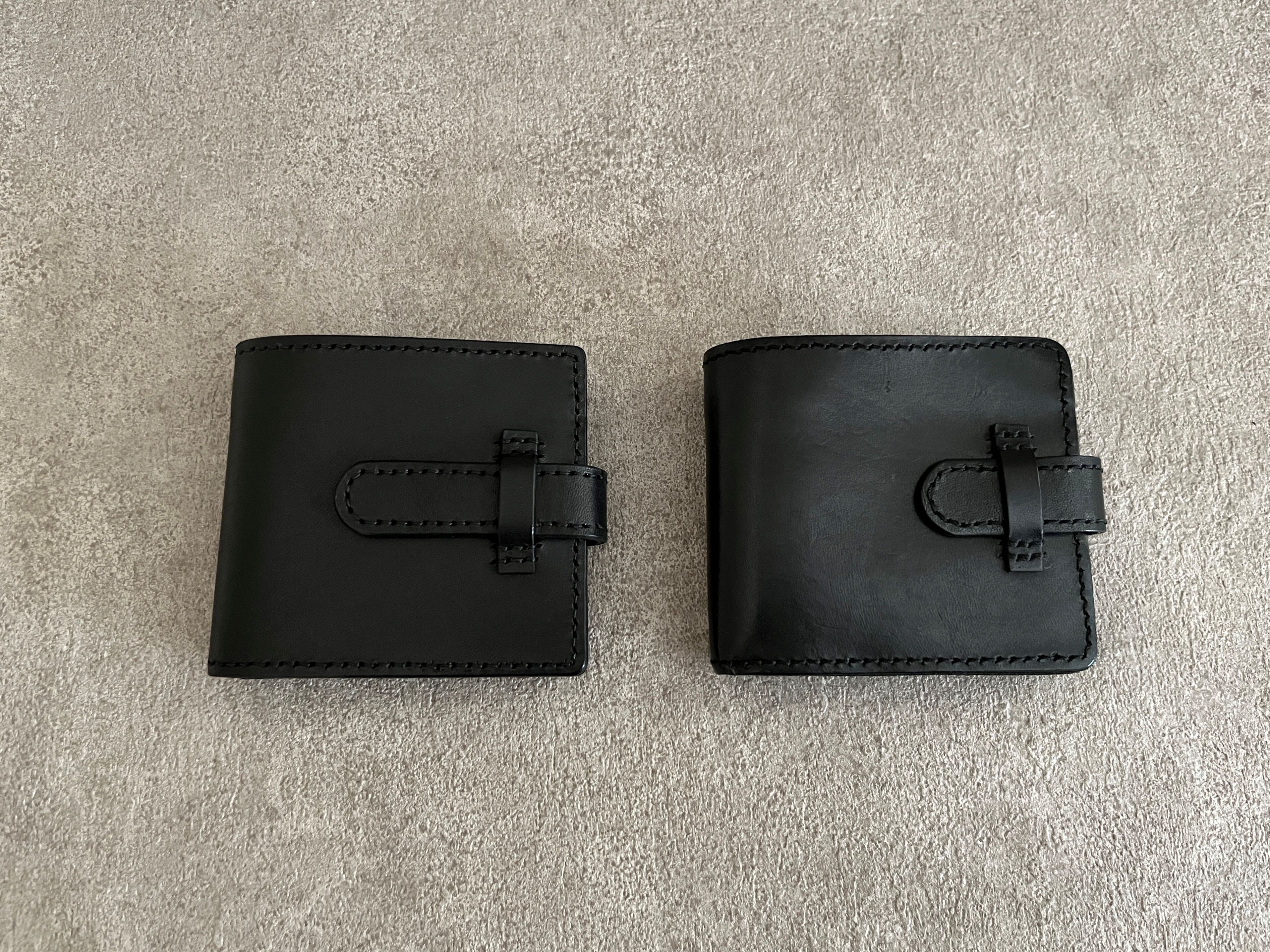 右側にサンプルで作って半年ほど使った同じ形の財布を並べてます。