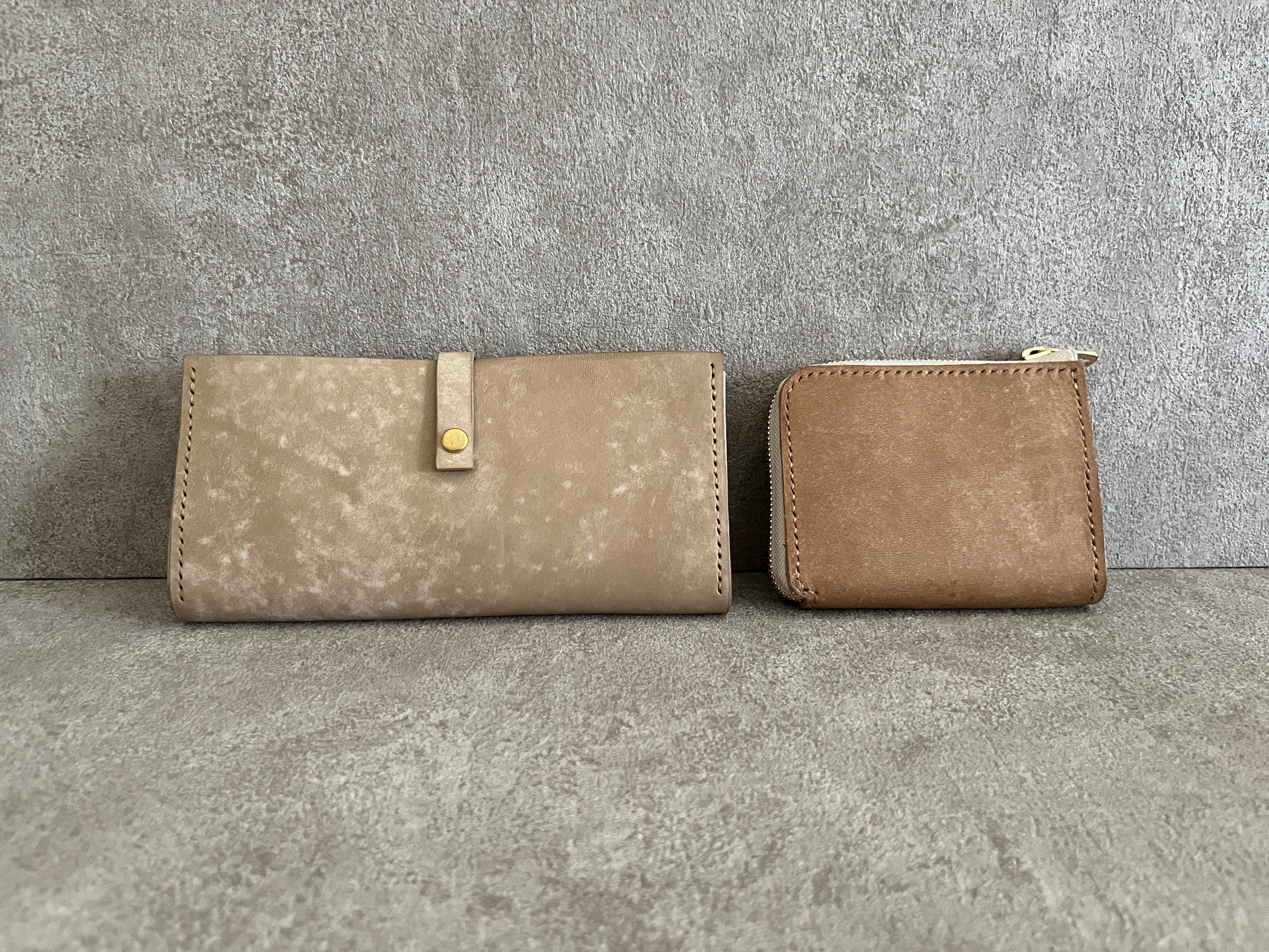 和紙のような手触りで張りのある硬めのイタリアンレザーのグレージュを使って、