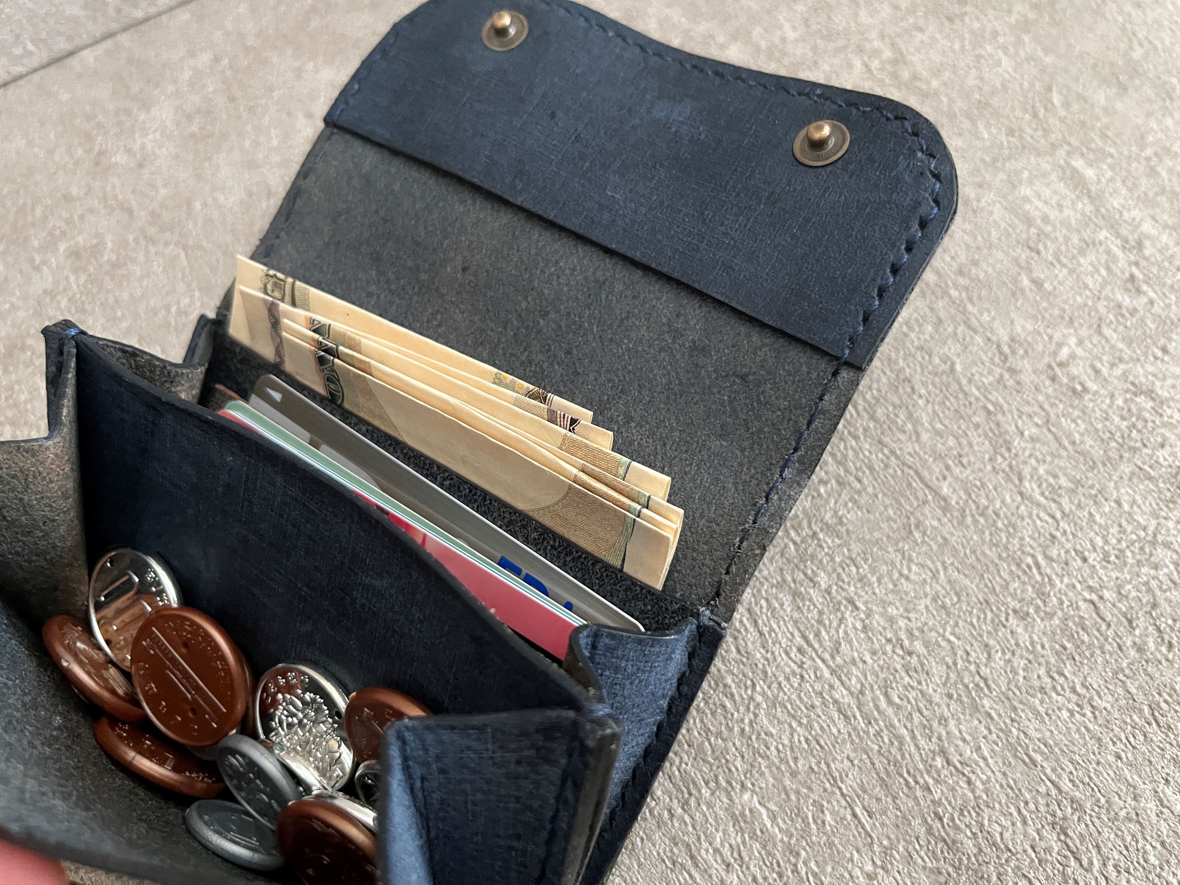 お札やカード、小銭を入れました。