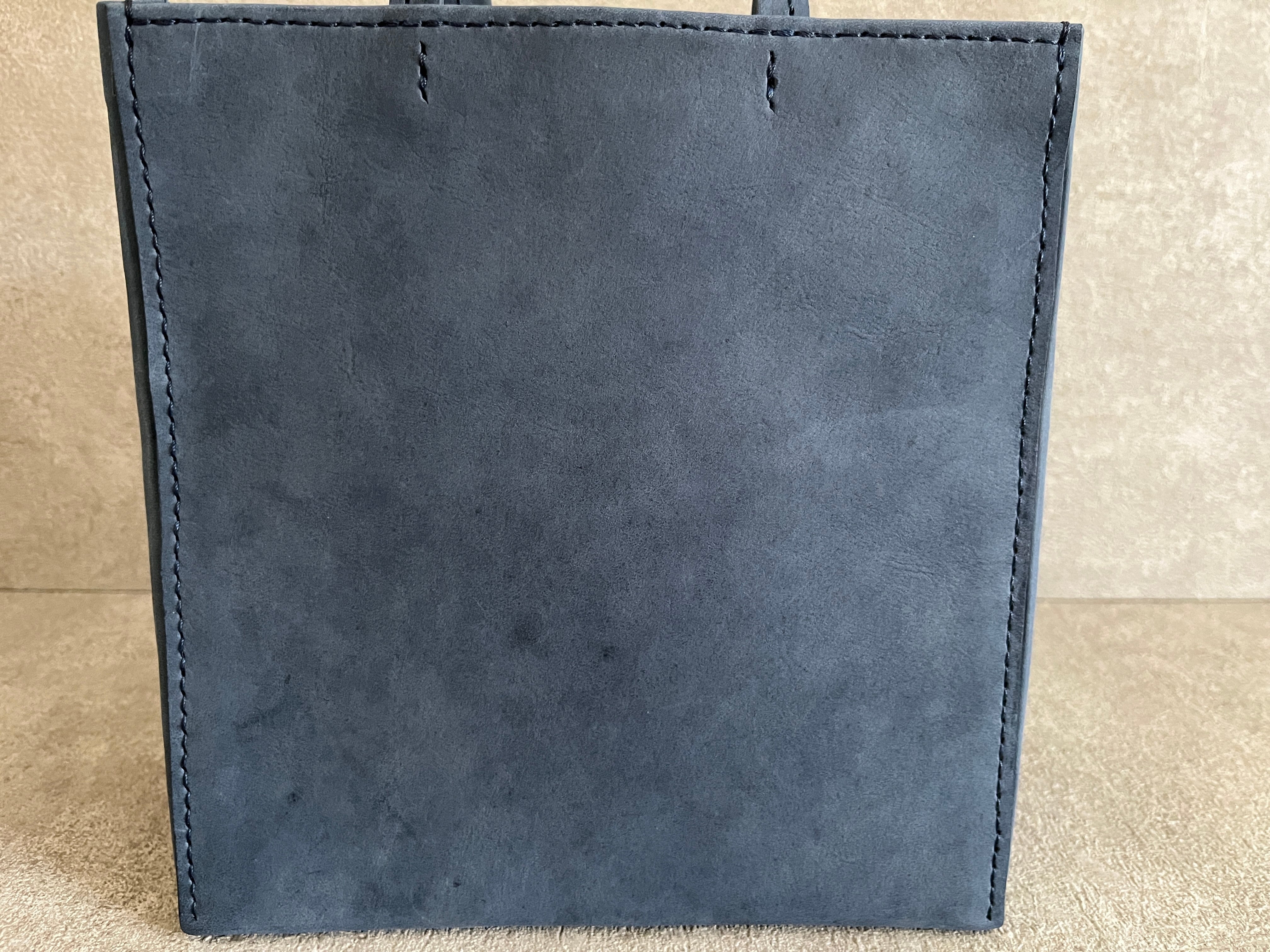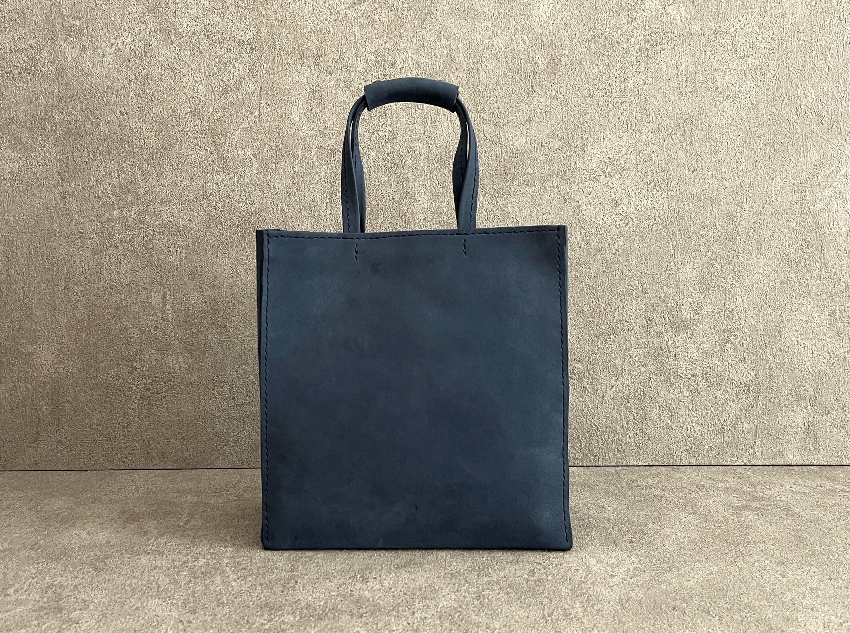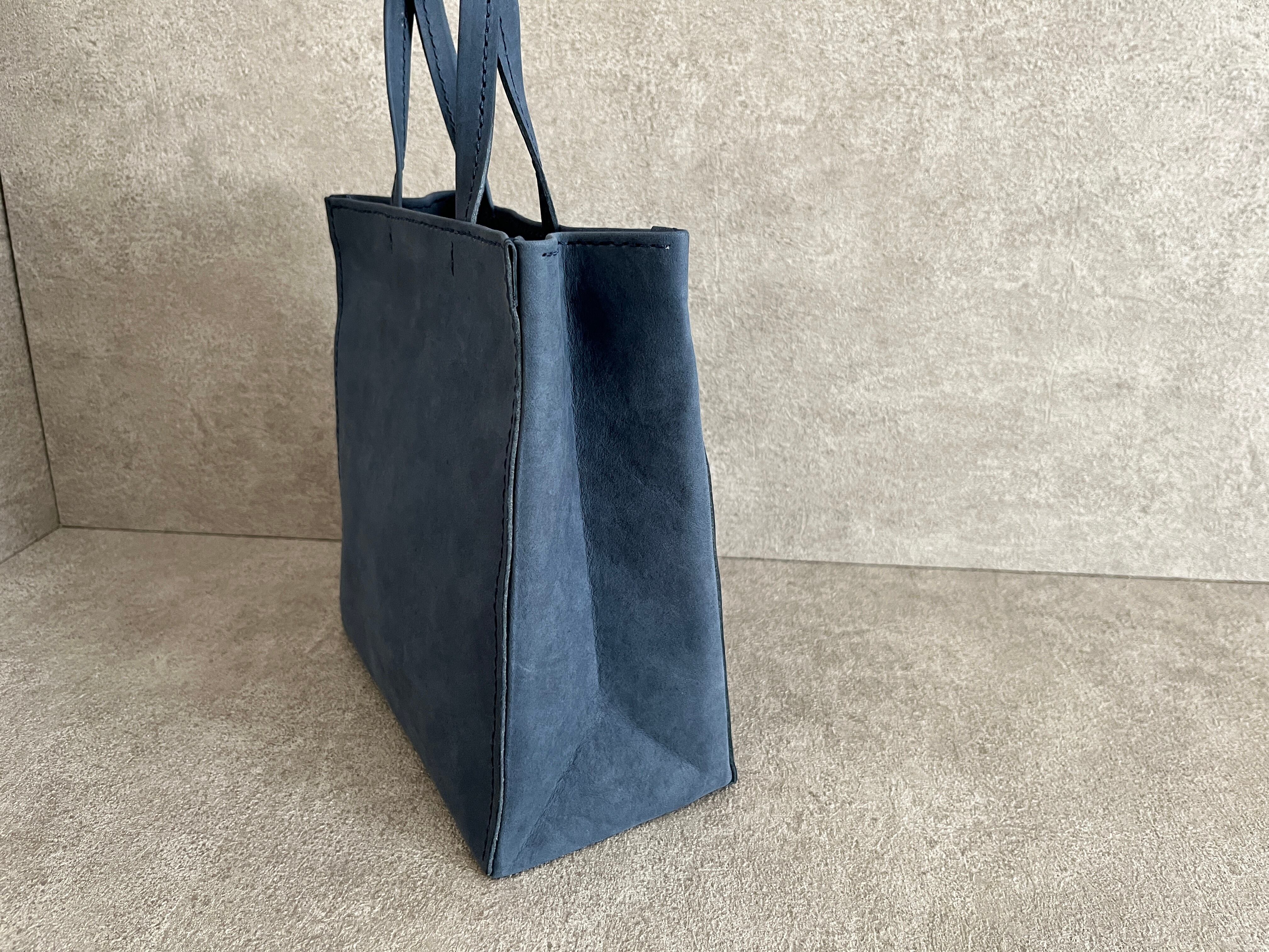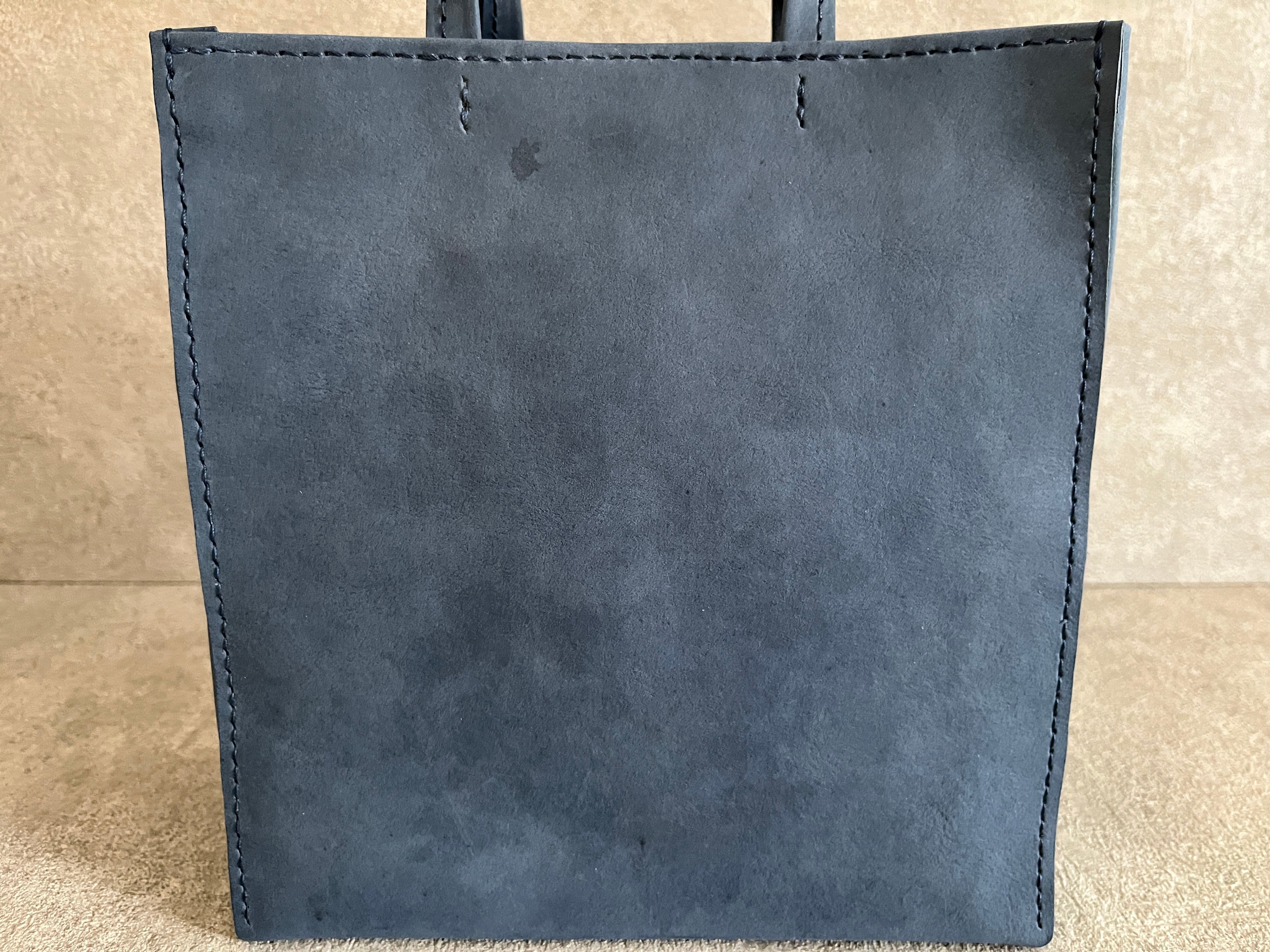 紙袋をヒントに、素朴な質感のイタリアンレザーを使い、手縫いで作りました。