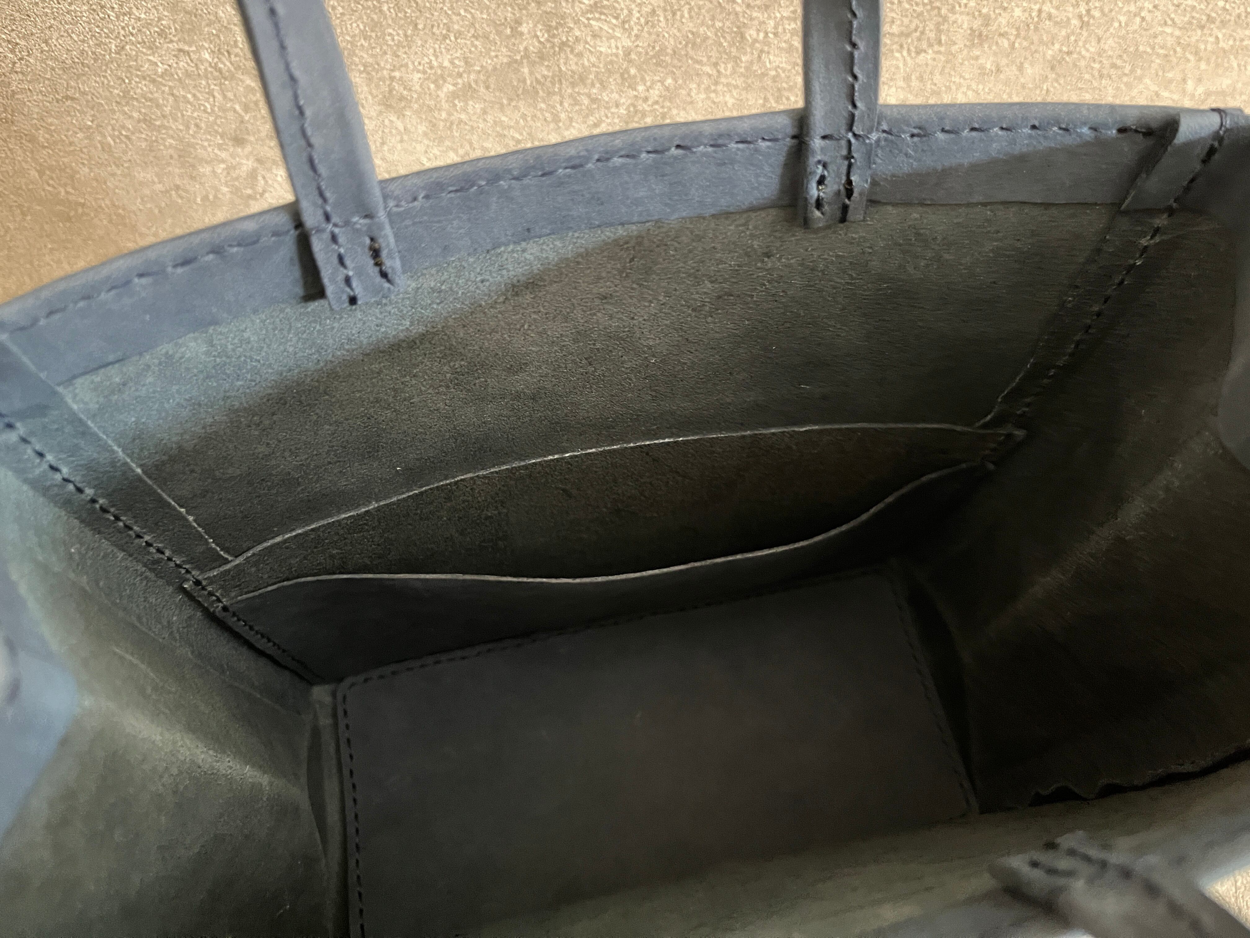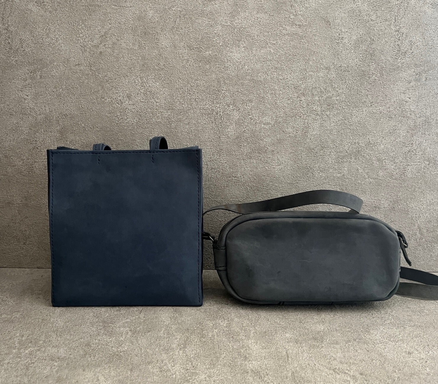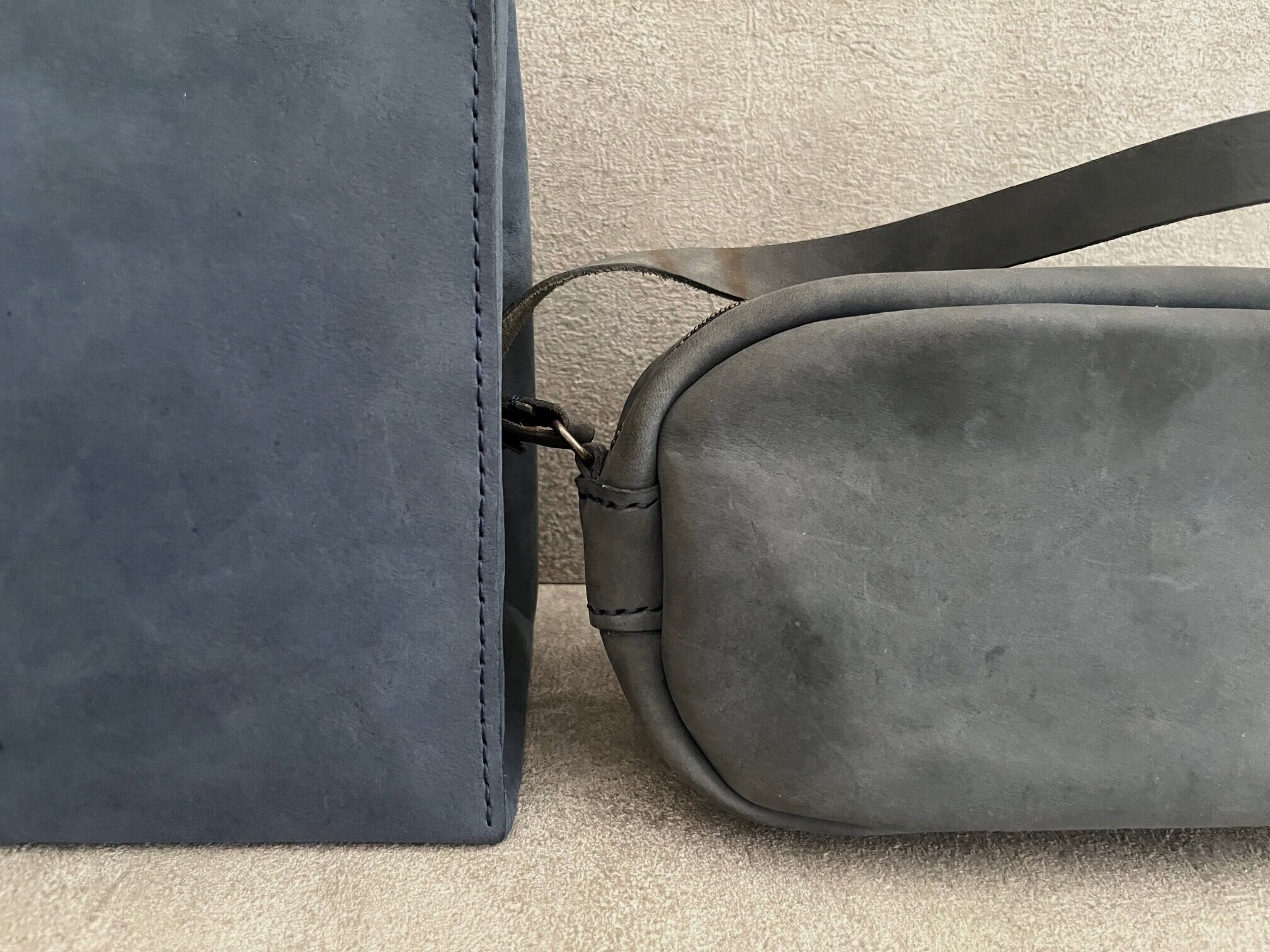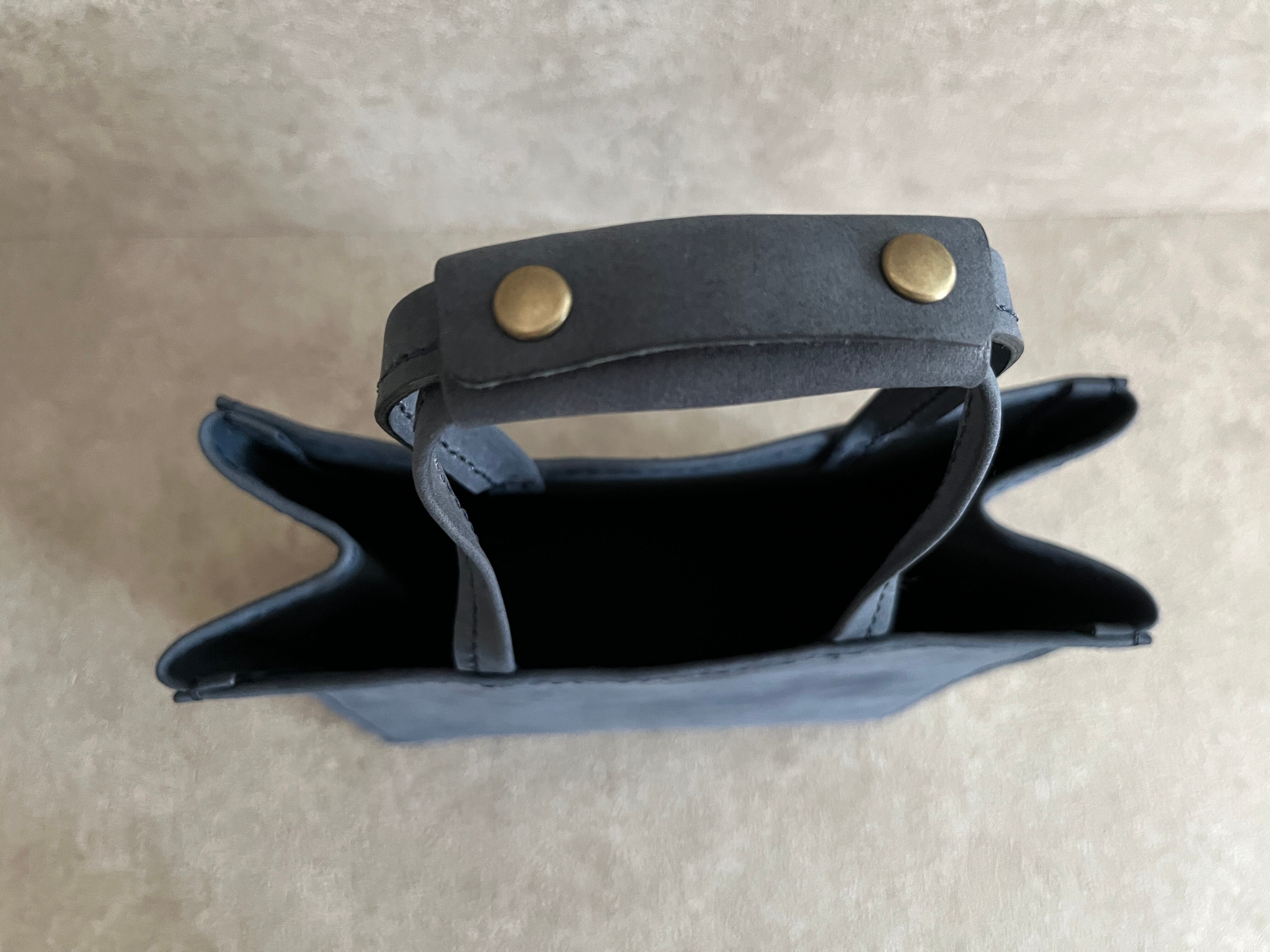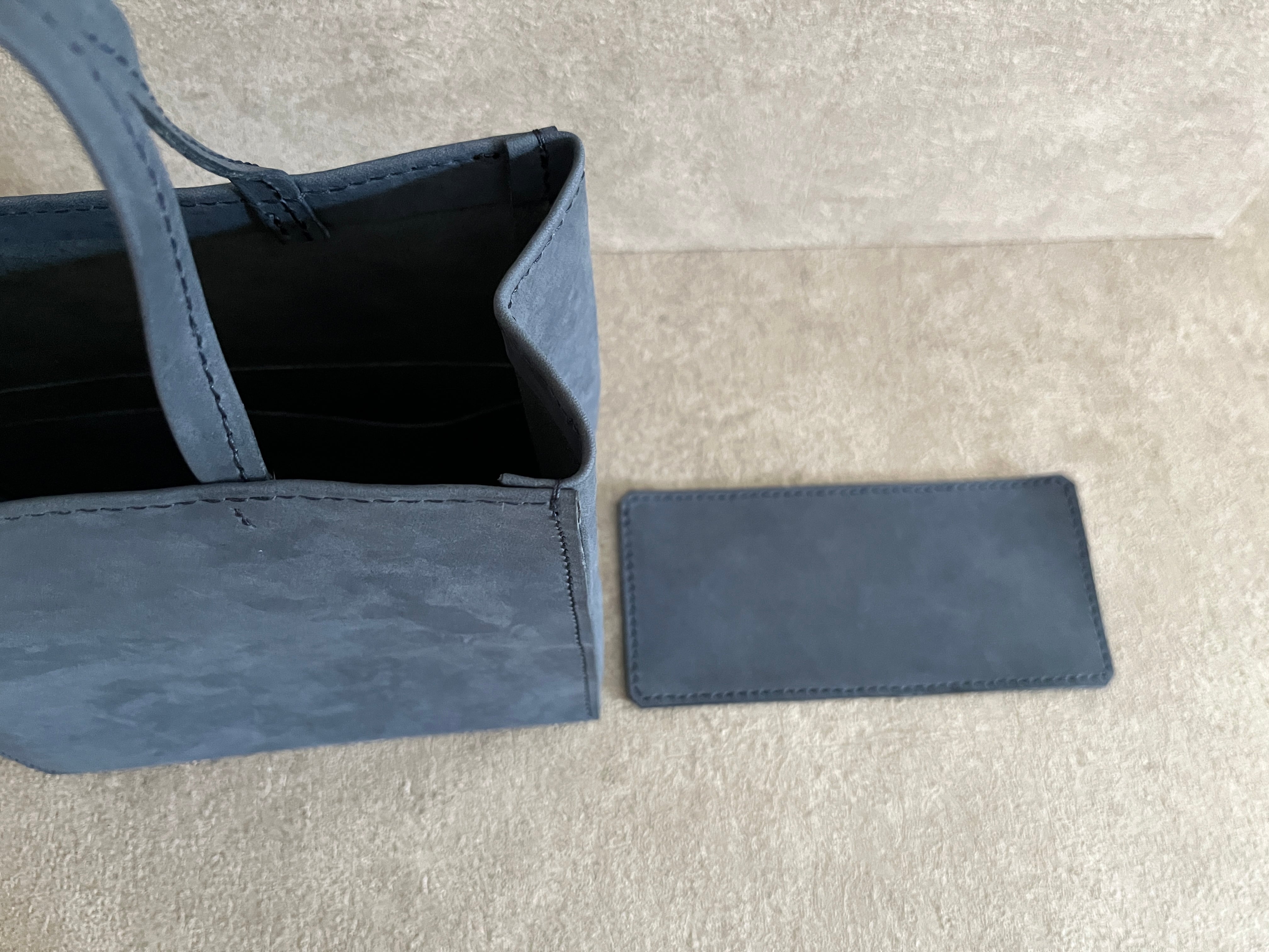 紙袋をヒントに、素朴な質感のイタリアンレザーを使い、手縫いで作りました。