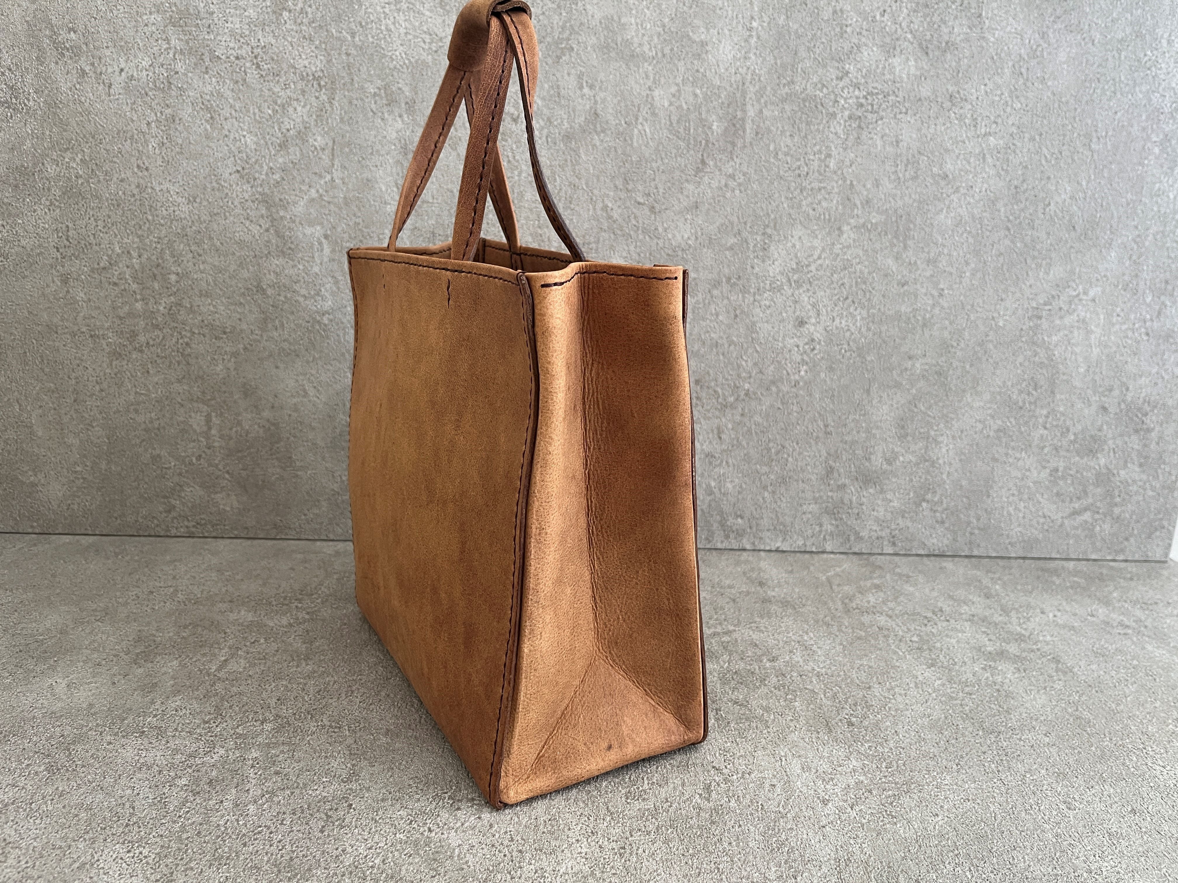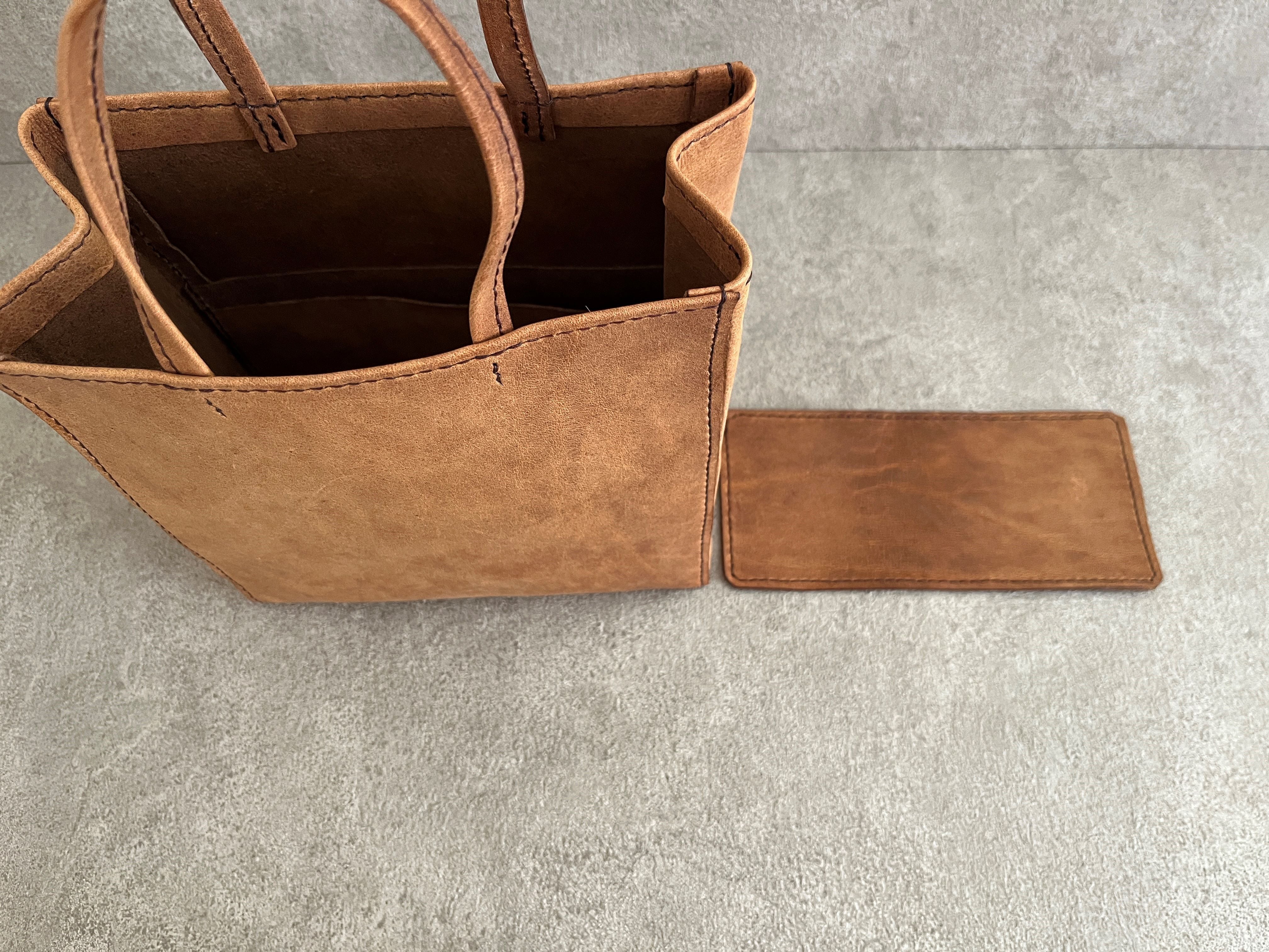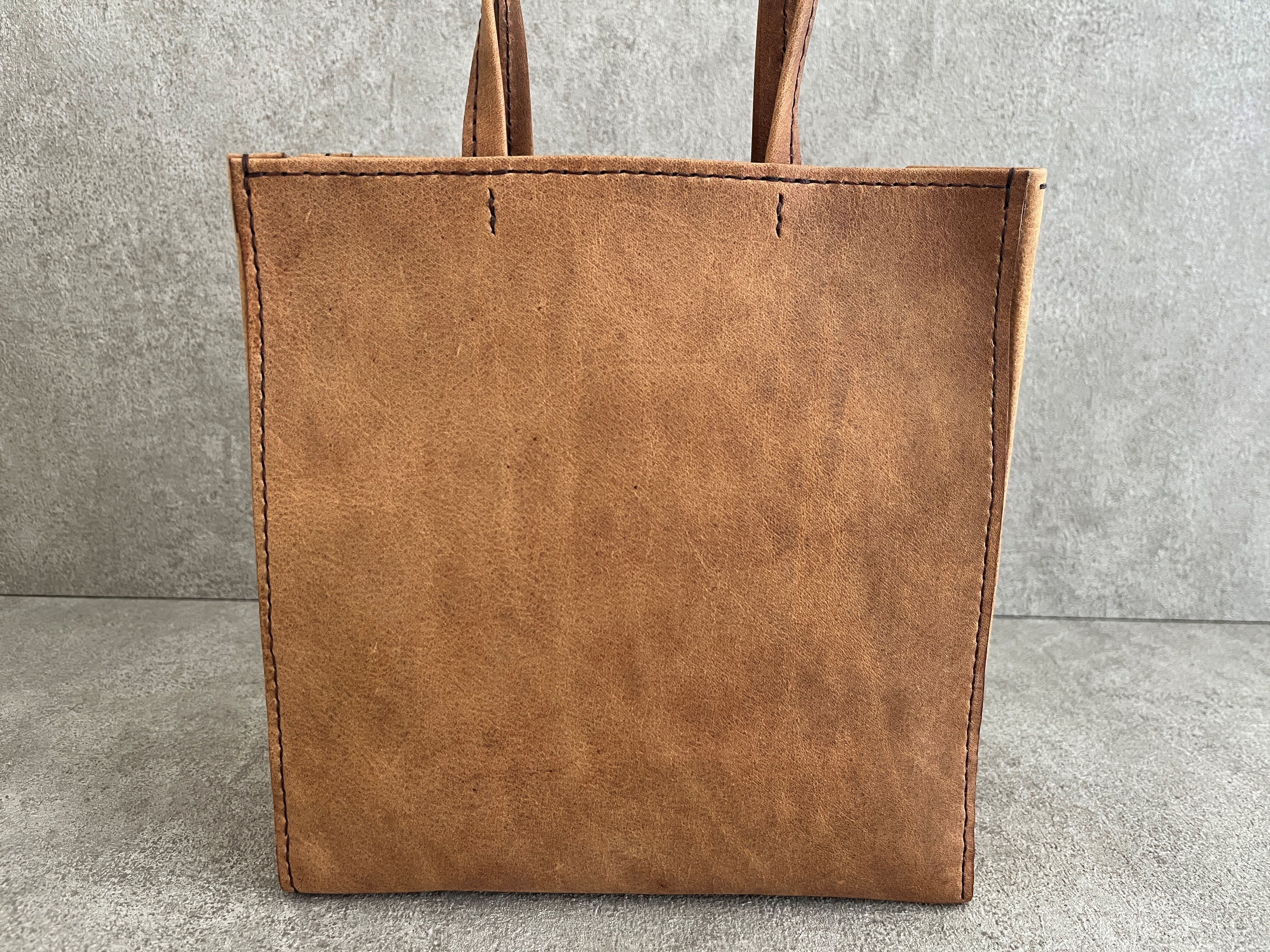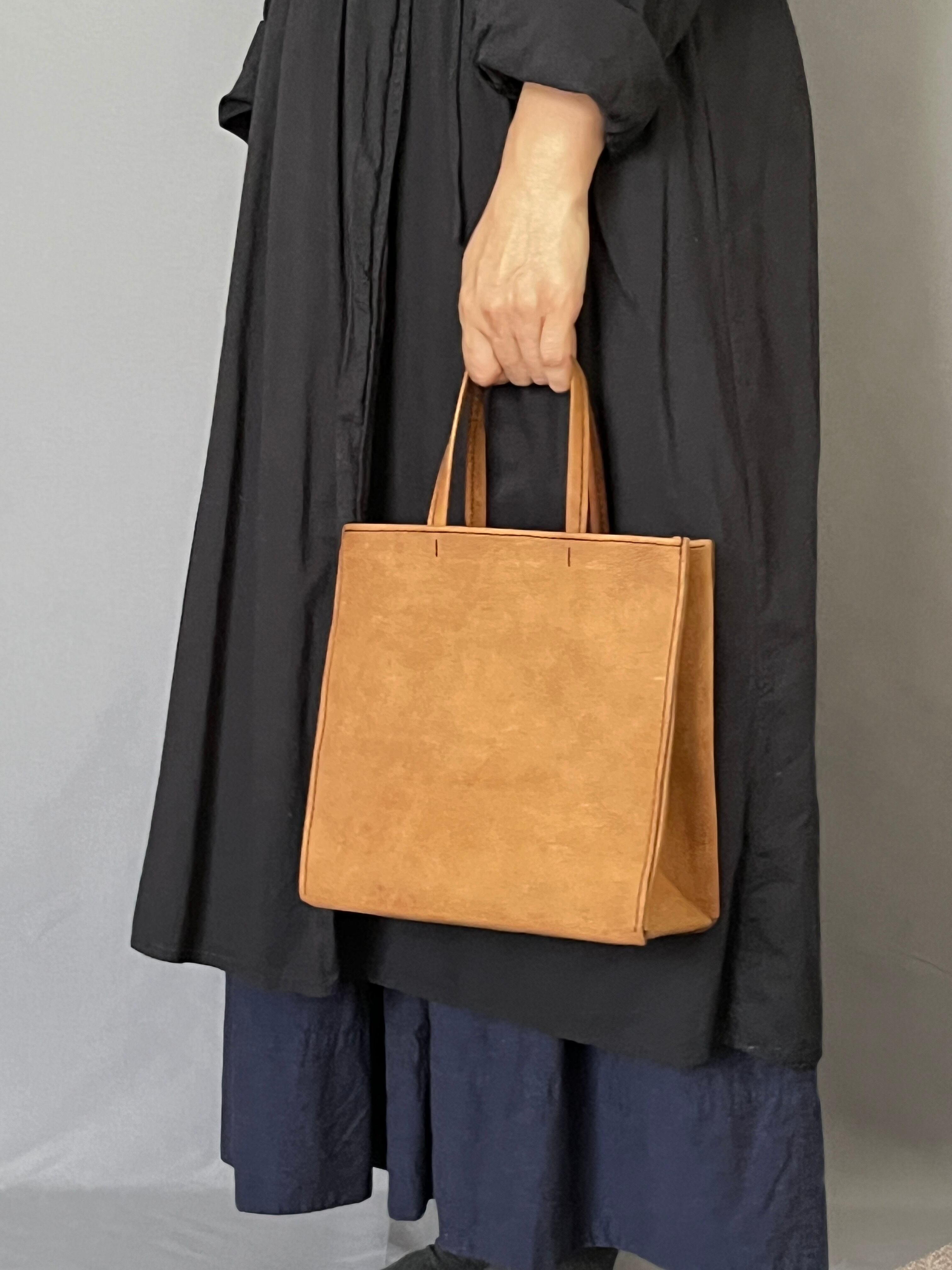 紙袋をヒントに、素朴な質感のイタリアンレザーを使い、手縫いで作りました。