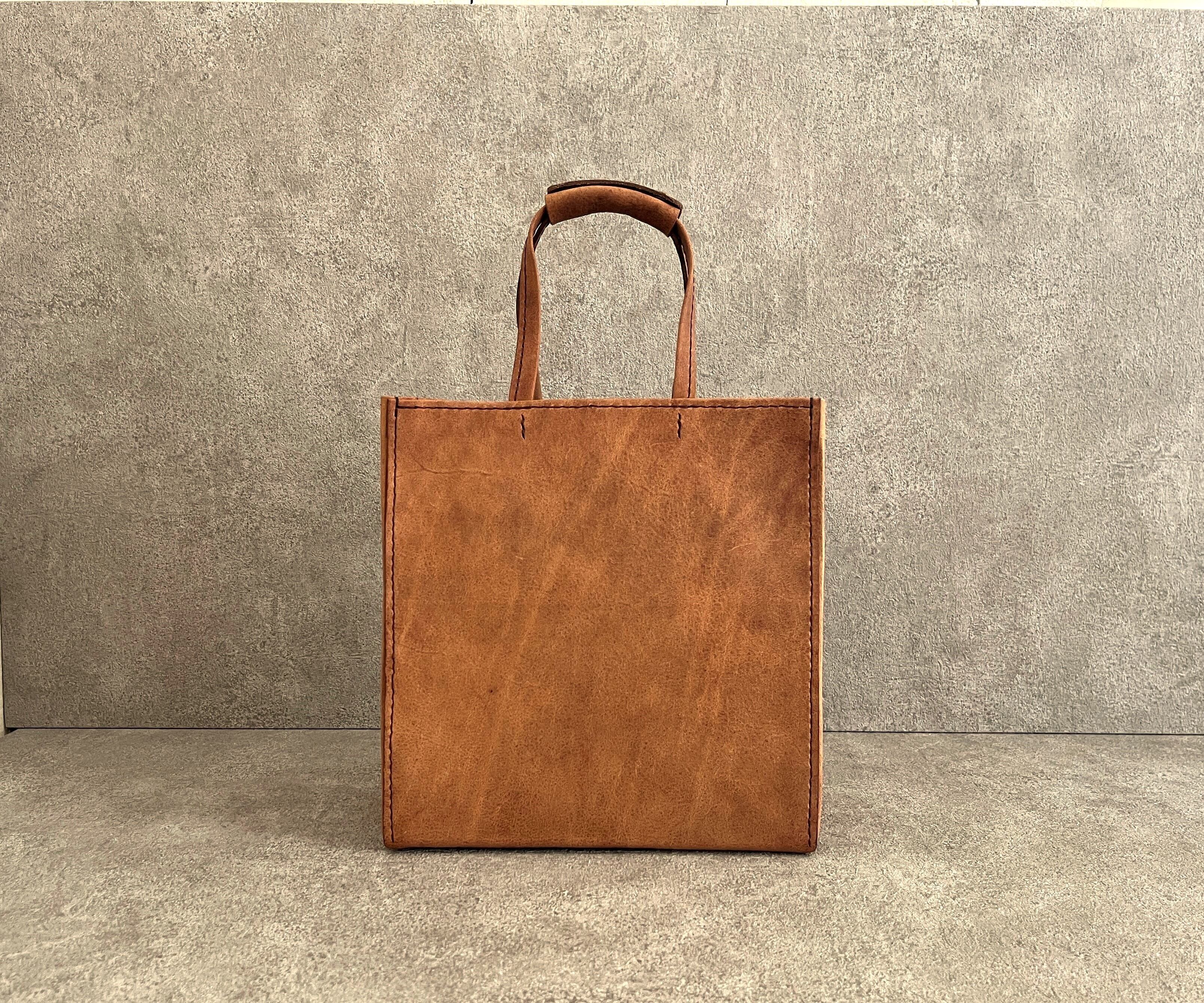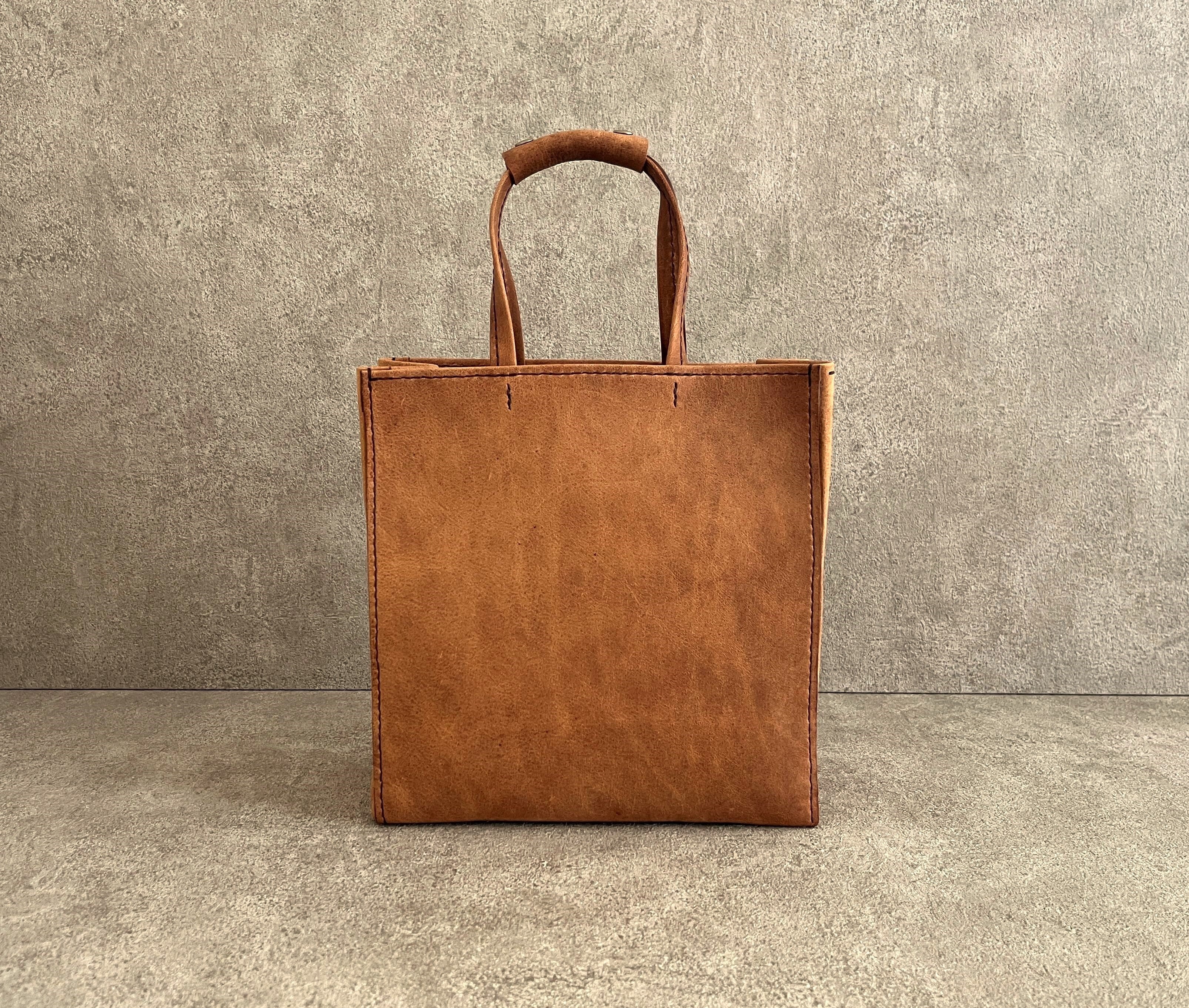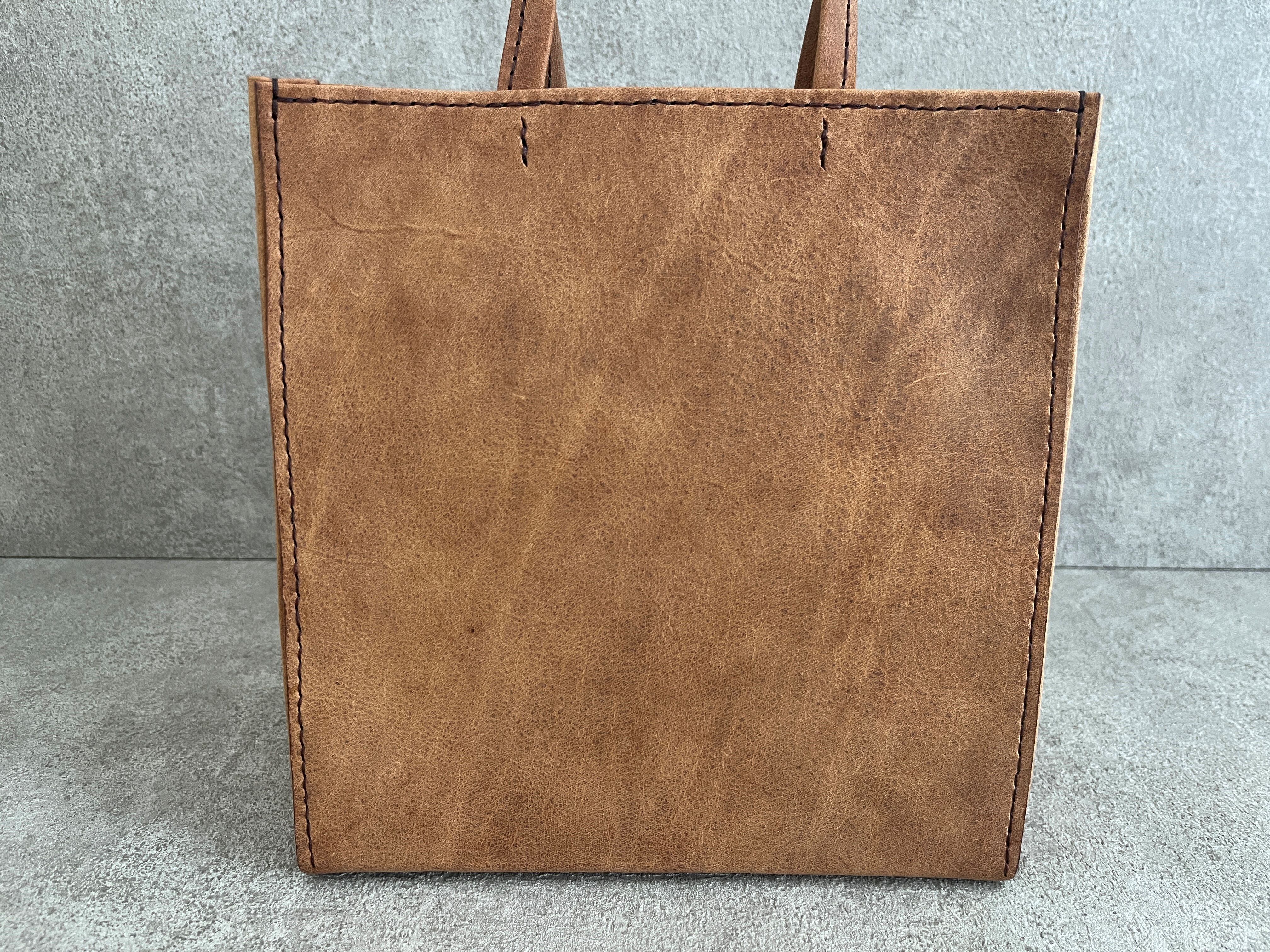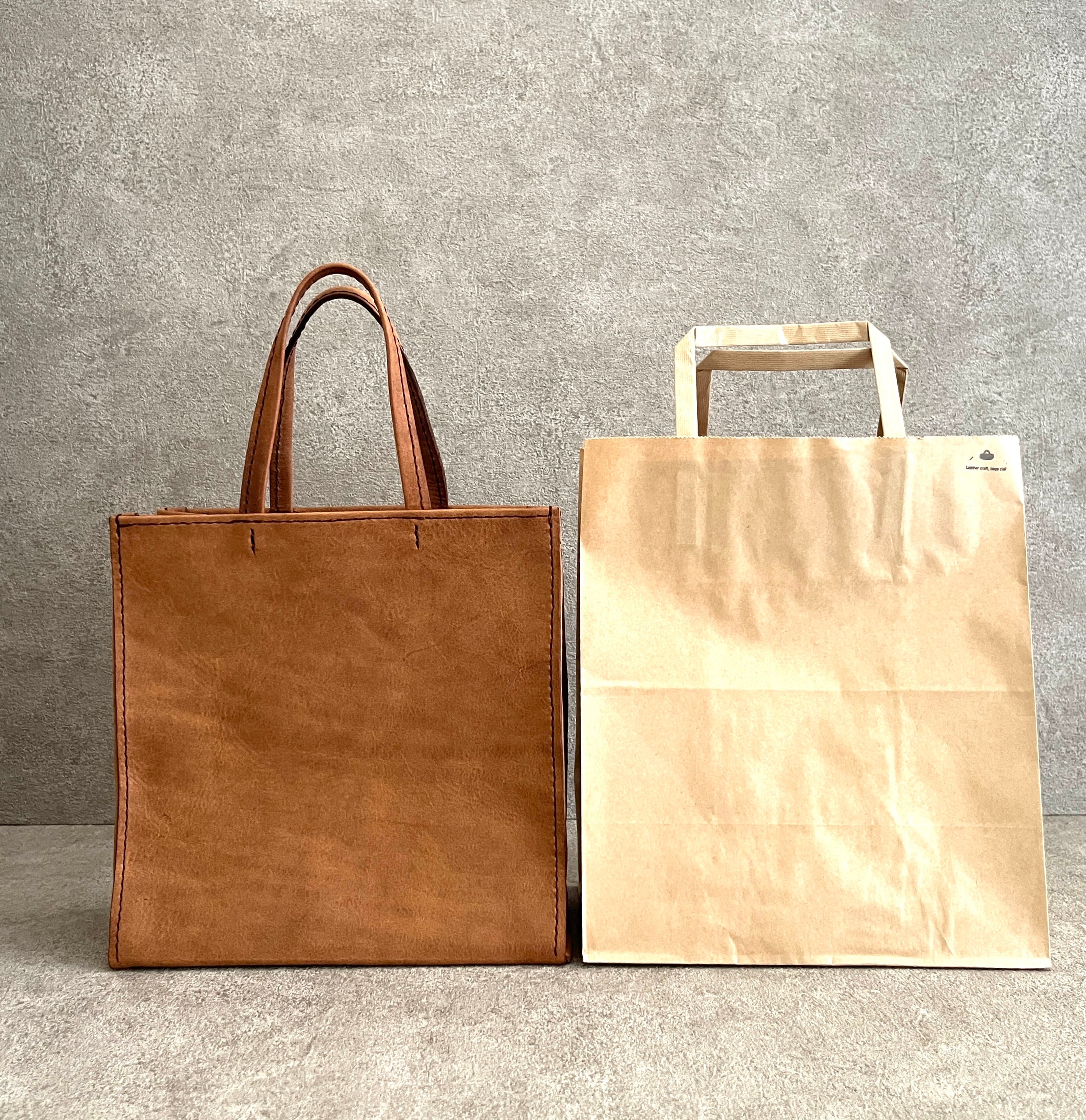 紙袋をヒントに、素朴な質感のイタリアンレザーを使い、手縫いで作りました。