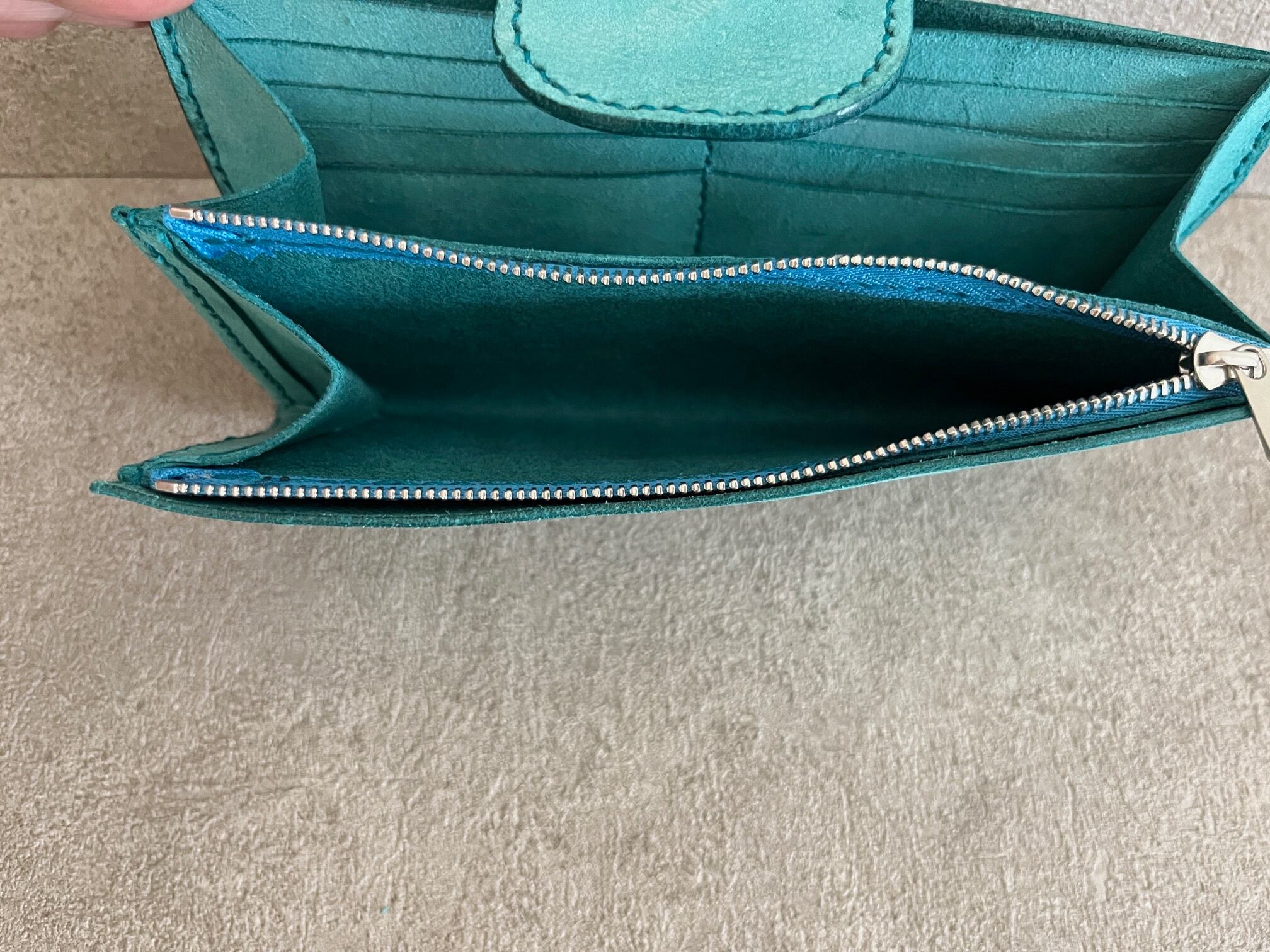 画像の終わりの方に同じ形で別の革で作った財布に中身を入れてます。